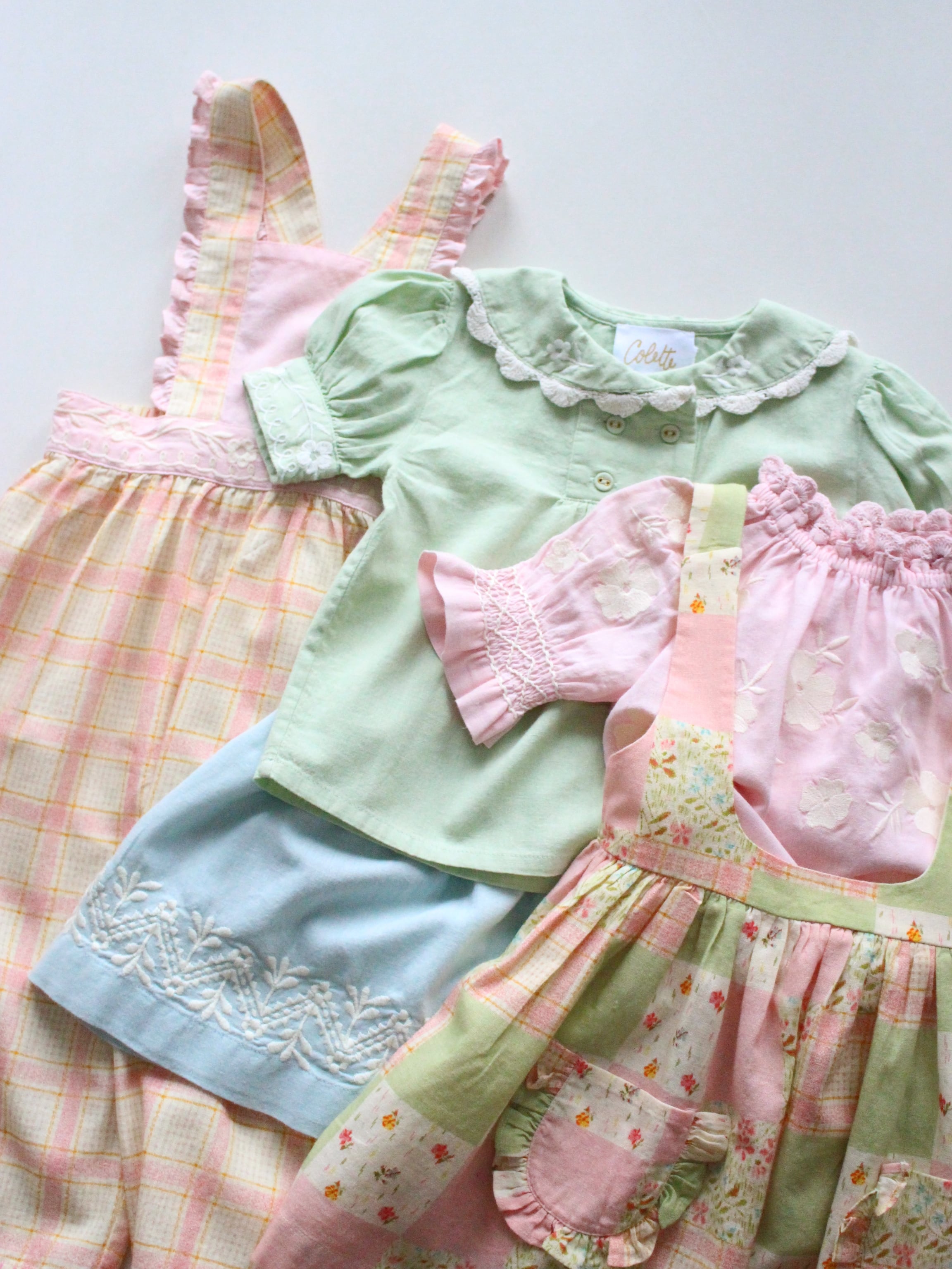 袖口のスモッキングや手編みのかぎ針襟が、さりげないヴィンテージ感を演出し、さらに裾のかぎ針編みの縁取りがシルエットを美しく引き立てます。