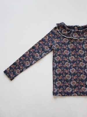 柔らかなオーガニック・ピマコットンを使用した長袖スリムフィットトップ。ギャザーを寄せたフリルネックにコントラストカラーのメロー仕上げを施し、背面の首元にはスナップ留めを備えています。
