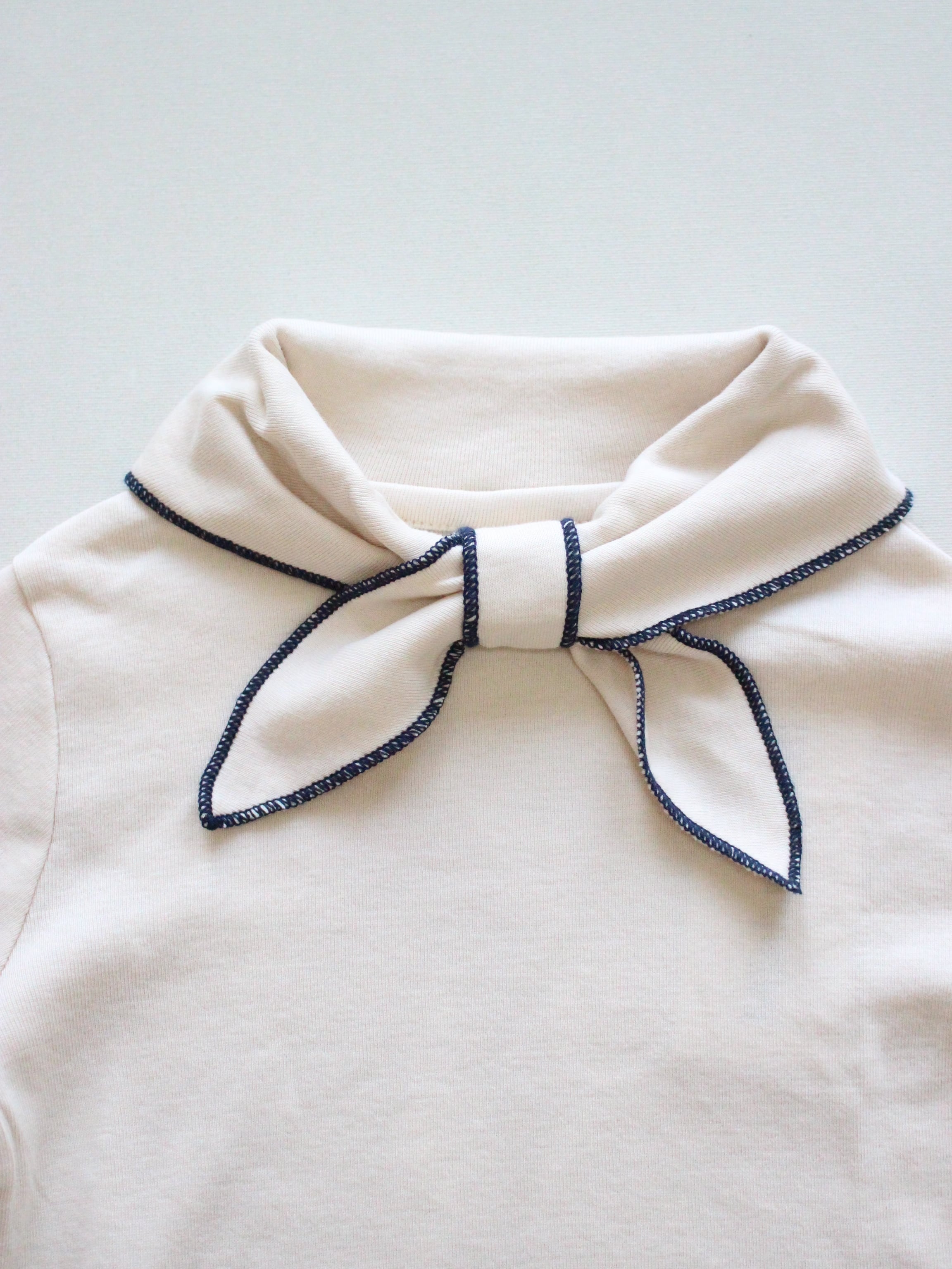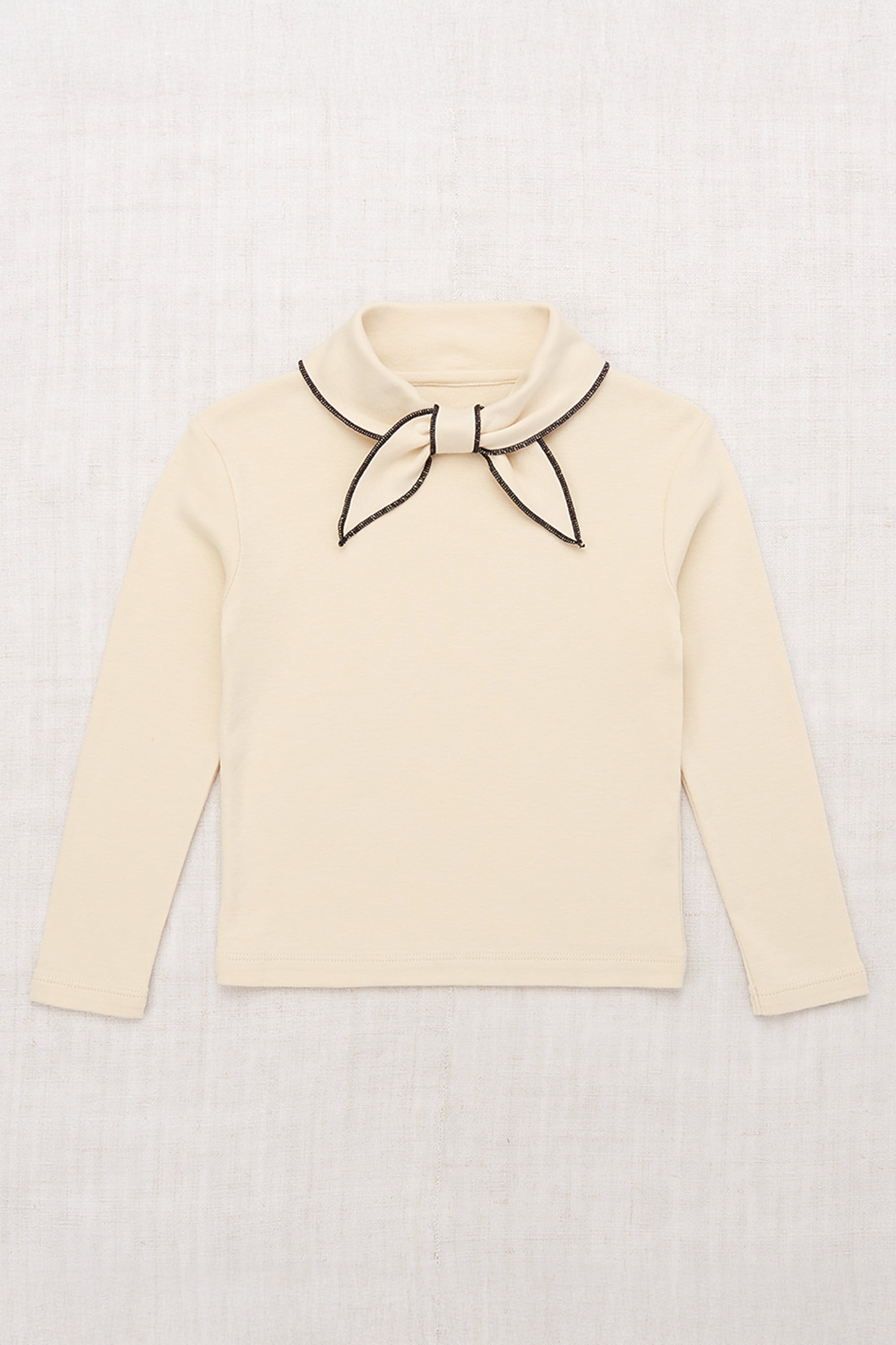 オーガニックピマコットンを使用した、Misha & Puffのシグネチャートップ。首元で結ぶプルスルータイプのケルチーフに、コントラストの効いたメロー仕上げがアクセント。1枚でも重ね着でも楽しめる、着回し力の高いアイテムです。