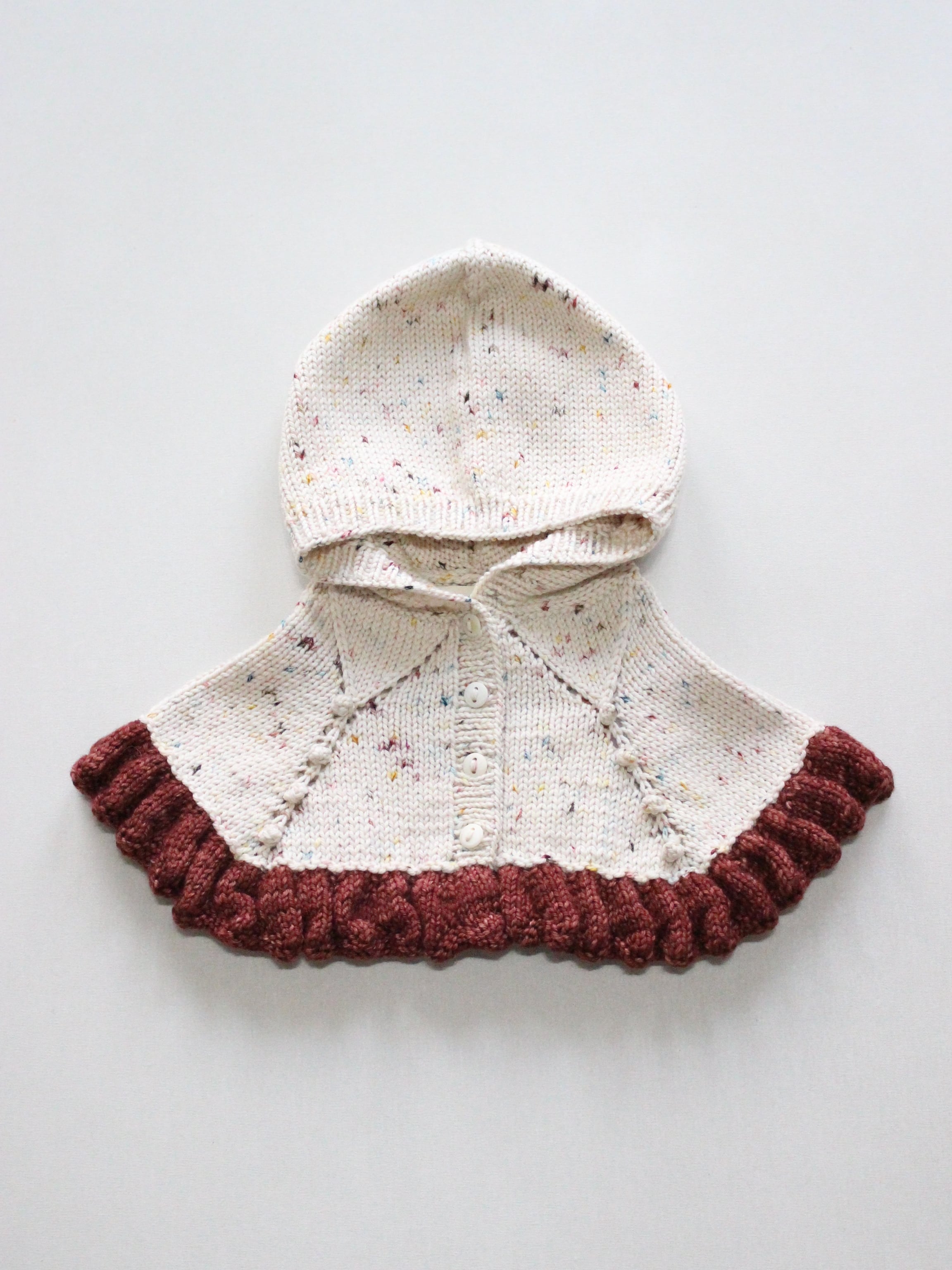 メリノウールで手編みされたケープレット。ボンネット風のフードが付いており、肩にふんわりとかかる小さなケープ部分が特徴です。裾にはフリルのトリムが施され、アイレット編みやポップコーン編みのディテールがアクセントになっています。前面はホーンボタンで留めるデザインです。