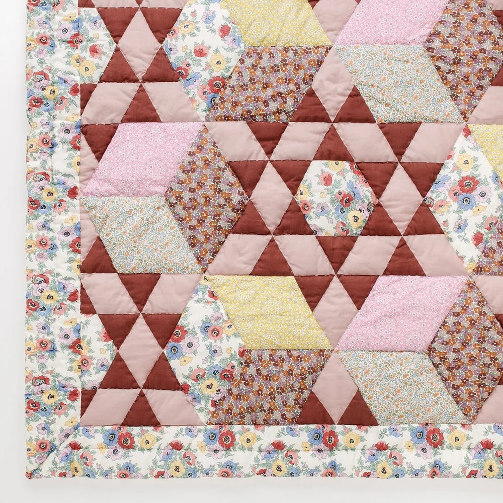 注目の Magda キルトは リバティ生地 を使用し、精巧にパッチワークされた サンデザイン が特徴です。無地の色合いがキルトの華やかなプリントを美しく引き立て、縁は全面プリントで仕上げられています。