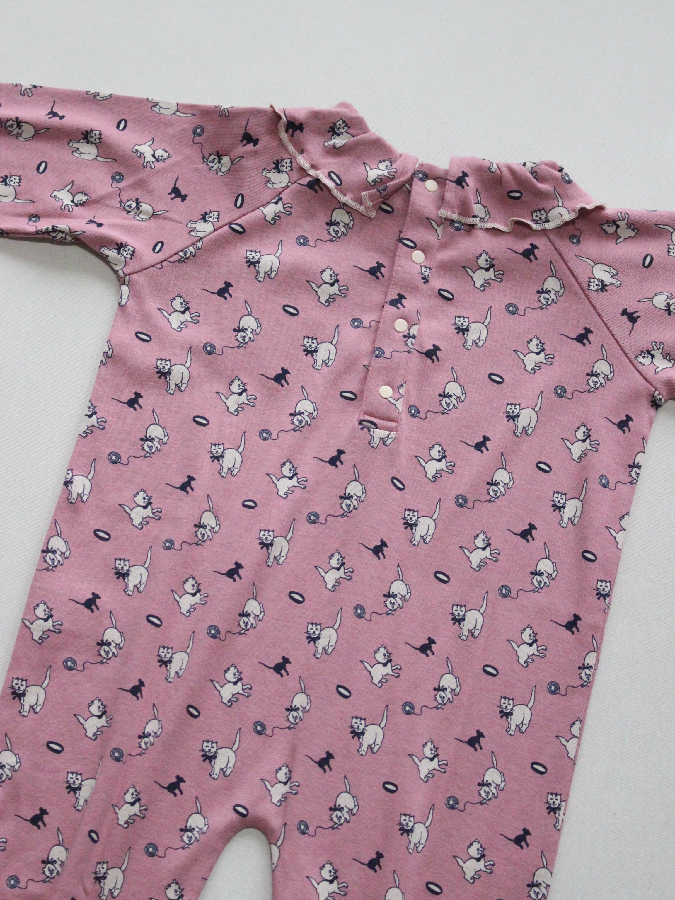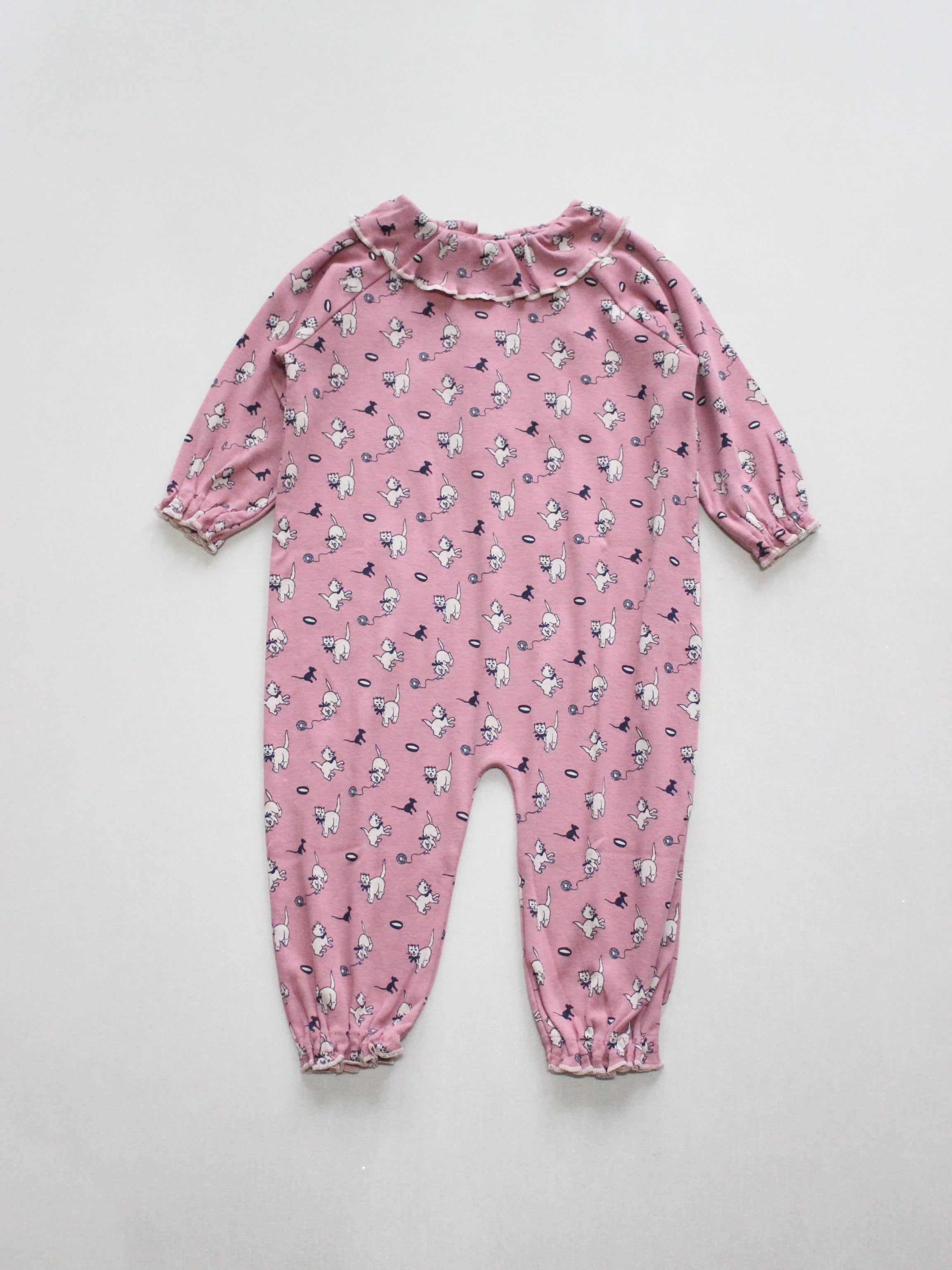 柔らかなオーガニックピマコットンを使用した、ゆったりとした長袖ロンパース。ふんわりとした丸みのあるシルエットで、袖口と足口にギャザーとコントラストカラーのメロー仕上げが施されています。後ろ首元にはスナップボタンの留め具付き。