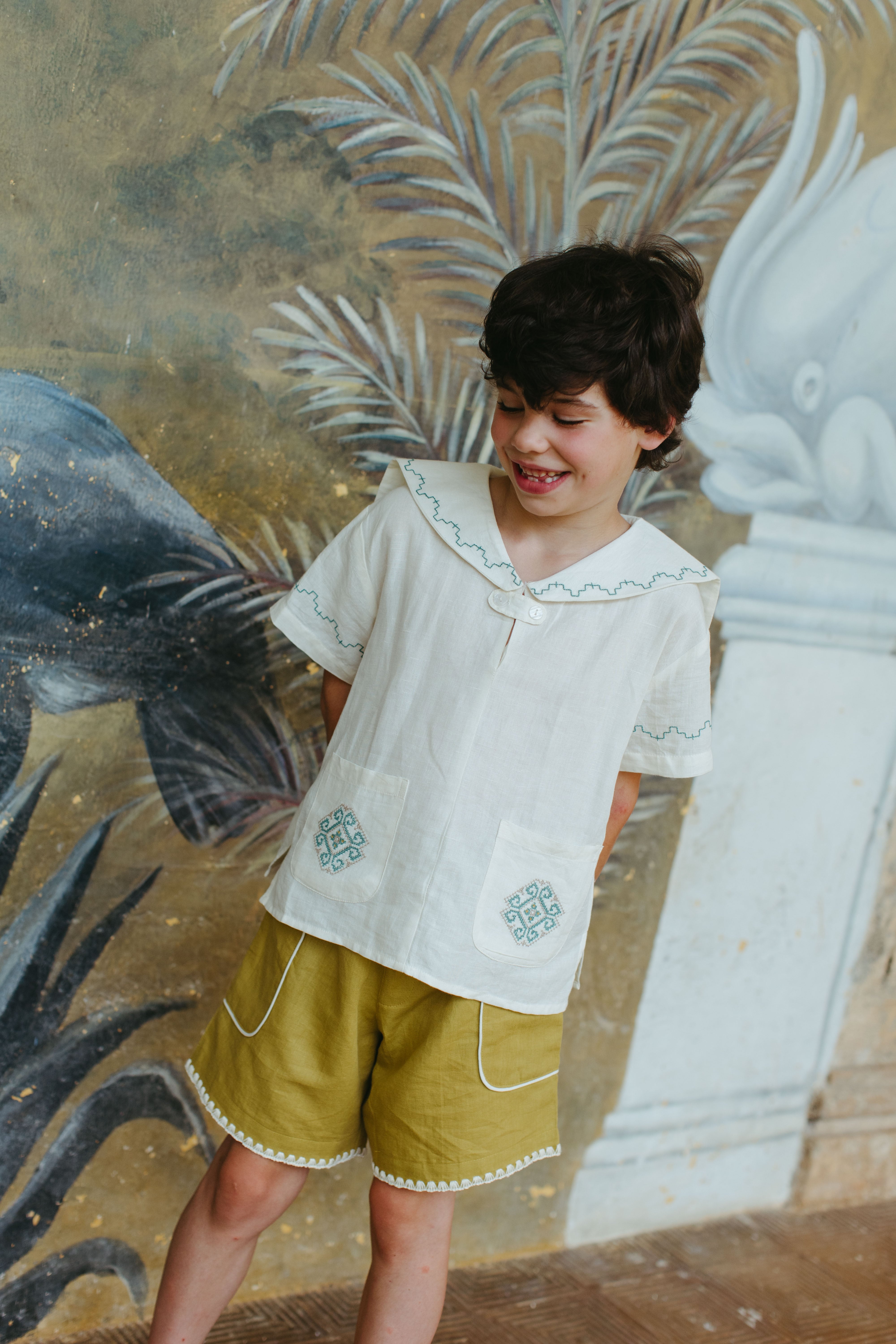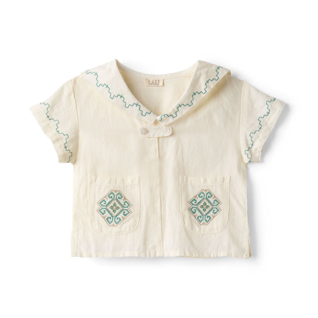 セーラー襟がかわいいリネン混のブラウス。
