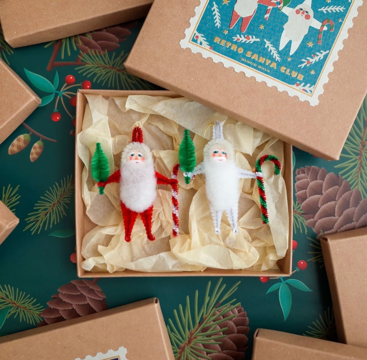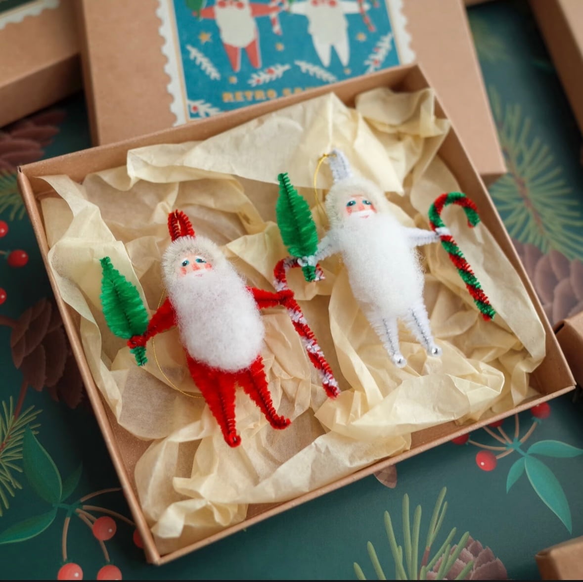 右手にもみの木、左手にステッキを持った、どこか懐かしいレトロなサンタです。